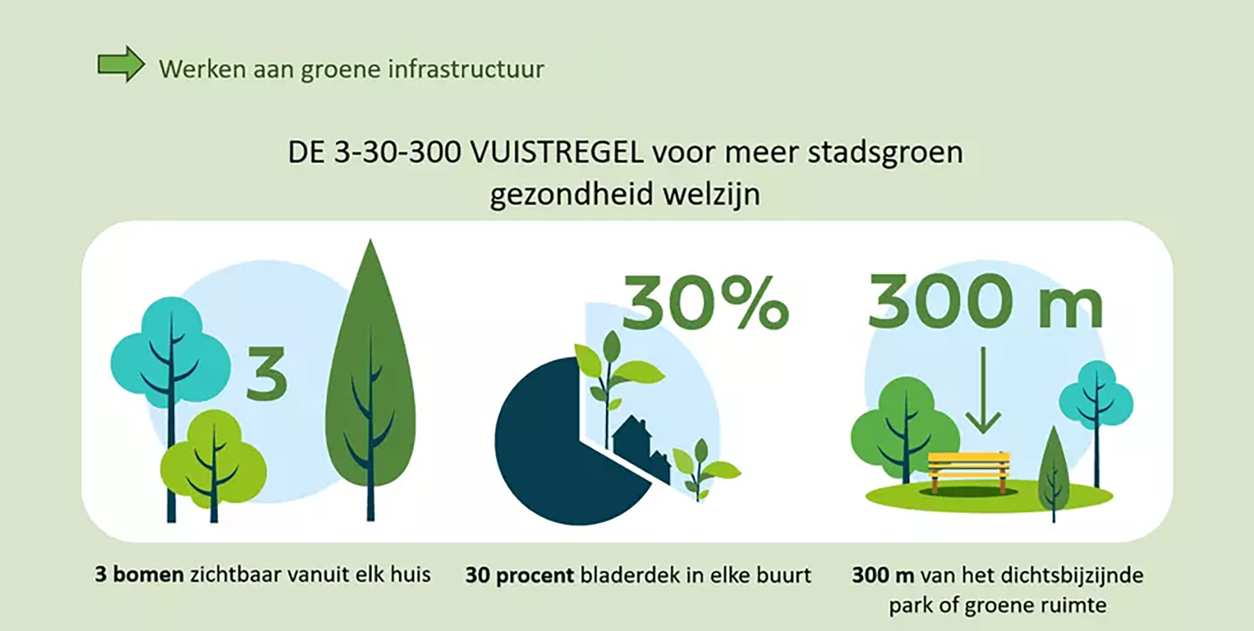 De 1ste regel is dat elke burger vanuit zijn huis minimaal 3 bomen (van behoorlijke omvang) moet kunnen zien. Recent onderzoek toont het belang aan van dichtbij, vooral zichtbaar, groen voor de geestelijke gezondheid en het welzijn.